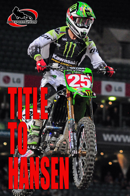 American Kawasaki rider Josh Hansen has won the 2010 Monster Energy Super X Championship in treacherous racing conditions at QSAC Stadium in Brisbane on Saturday night with Australian Suzuki rider Matt Moss claiming the overall Lites Championship after a down to the wire battle with American PJ Larsen.