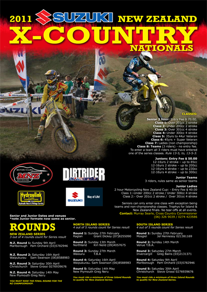 Suzuki again sponsors the separate North Island, South Island and New Zealand Championship series, with Raglan hosting round one in the North Island while Mosgiel opens the South Island championship series.