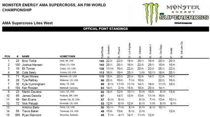 Western Regional Supercross Lites class season standings:
