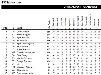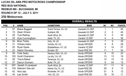 Meanwhile, in the 250cc class, it was a Kawasaki clean sweep with Blake Baggett finishing 1-1, Scotsman Dean Wilson finishing 2-2 and South African Tyla Rattray going 3-3 at Red Bud.