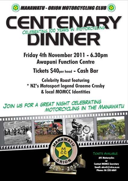 The club reminds prospective guests that dinner tickets need to be purchased before Tuesday, November 1. The dinner is set for the Awapuni Function Centre and tickets cost $40 per person. Tickets are available at AFC Motorcycles or contact MOMCC secretary at akcvit@xtra.co.nz