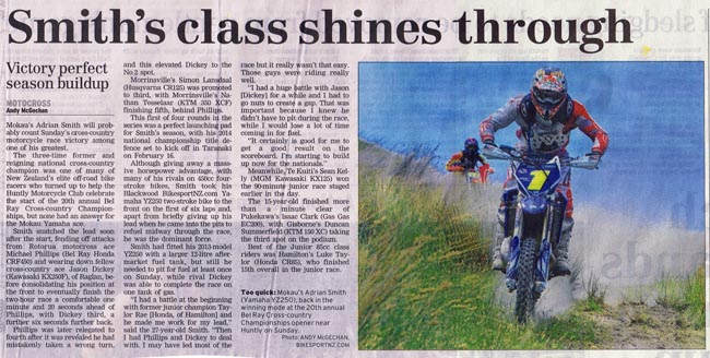 But, as well as posting a huge chunk of home-grown material on this site, every single week, BikesportNZ.com breaks through the invisible barrier to give the motorcycling community – be it fans of motocross, supercross, enduro, cross-country racing, trials riding or superbikes – wicked widespread coverage in the nation’s mainstream media.
