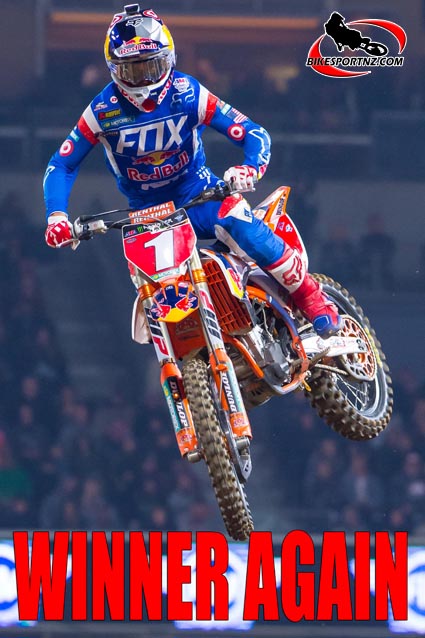 Nine points sat between Team Red Bull KTM Factory Racing’s Ryan Dungey and Monster Energy Kawasaki’s Eli Tomac entering the night, but when the dust settled after a thrilling 450SX class main event it was Dungey who walked away with his fourth title, and his third in a row.