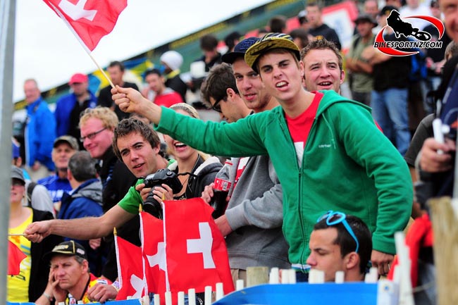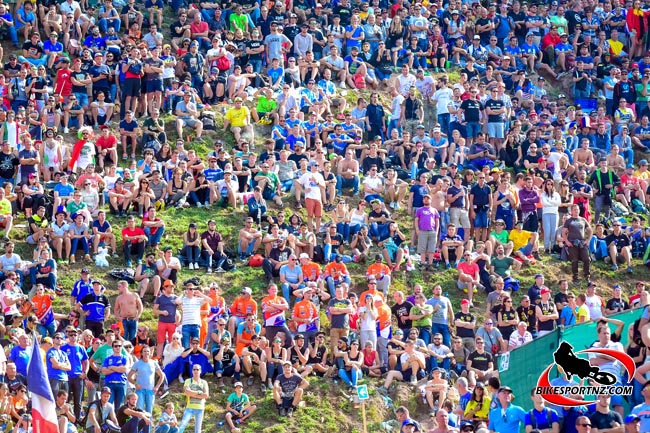 New Zealand’s Cody Cooper, weaving among the crowd during race action at the Motocross of Nations in England in 2008. Photo by Andy McGechan, BikesportNZ.com