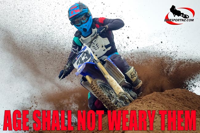 Laurence Binyon’s poem “For the Fallen”, perhaps known to many who hear it each year on Anzac Day as the Ode of Remembrance, immortalised the words ” Age shall not weary them, nor the years condemn” and those words could well be used to describe the many “old soldiers of motocross” who battled at the 2017 New Zealand Veterans’ and Women’s Motocross Championships near Eltham at the weekend.