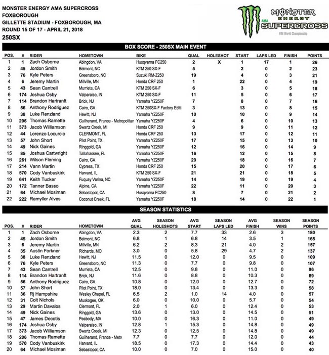“What a great day in Foxborough,” said Osborne. “I was able to win both my heat and the Main Event. I figured something out with my starts, and I pulled two holeshots. It was just a really good night. I’m happy, and I’ll take a 15 point lead into the finals.”