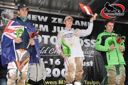 The 125cc podium at the FIM Junior Motocross World Championships in New Zealand in 2009 (from left) runner-up Tye Simmonds, champion Eli Tomac and third-ranked Hamish Dobbyn. Photo by Andy McGechan, BikesportNZ.com