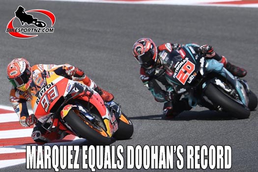 Taking his 54th win in the premier class, Marquez draws level with the legendary Mick Doohan as the most successful premier class Honda rider.