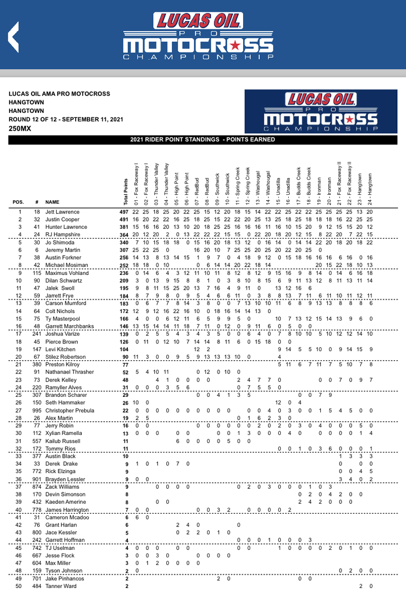 Sibling rival and team-mate Hunter Lawrence finished third overall in the title chase, having taken two moto wins and one overall victory, making the Lawrence brothers the only brothers to both finish an AMA Pro Motocross Championship in the top three.