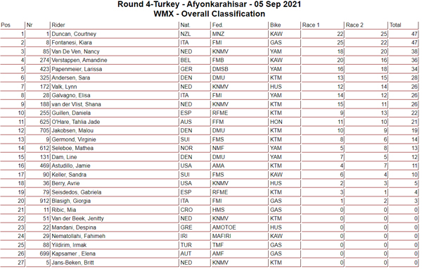 - Courtney Duncan (NZL, KAW), 132 points; 2. Kiara Fontanesi (ITA, GAS), 117 p.; 3. Shana van der Vlist (NED, KTM), 113 p.; 4. Nancy Van De Ven (NED, YAM), 110 p.; 5. Lynn Valk (NED, HUS), 98 p.; 6. Larissa Papenmeier (GER, YAM), 95 p.; 7. Amandine Verstappen (BEL, KAW), 94 p.; 8. Sara Andersen (DEN, KTM), 72 p.; 9. Daniela Guillen (ESP, KTM), 72 p.; 10. Elisa Galvagno (ITA, YAM), 51 p.