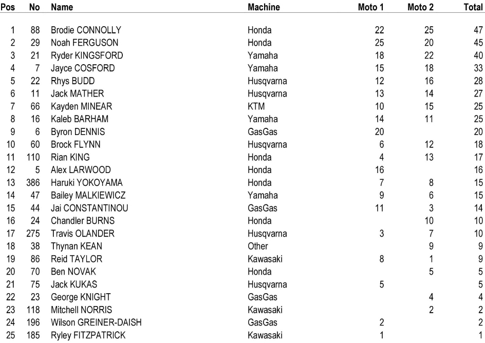 Connolly grabbed the moto two holeshot and never looked back as he charged to a comfortable win. The Kiwi quickly established and managed a 12-second lead over the rest of the field, cruising to the overall ahead of Kingsford.