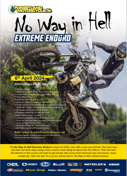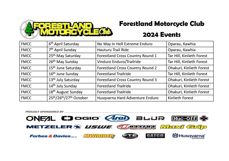 The event is jointly sponsored by Husqvarna motorcycles, Forbes and Davies accessory distributors, O’Neal apparel, Maxima oils, Arai helmets, Ogio bags, Blur, Maxi Grip, Kiwi Rider magazine, Muck-Off, Metzeler tyres, USWE and SATCO logging attachments.