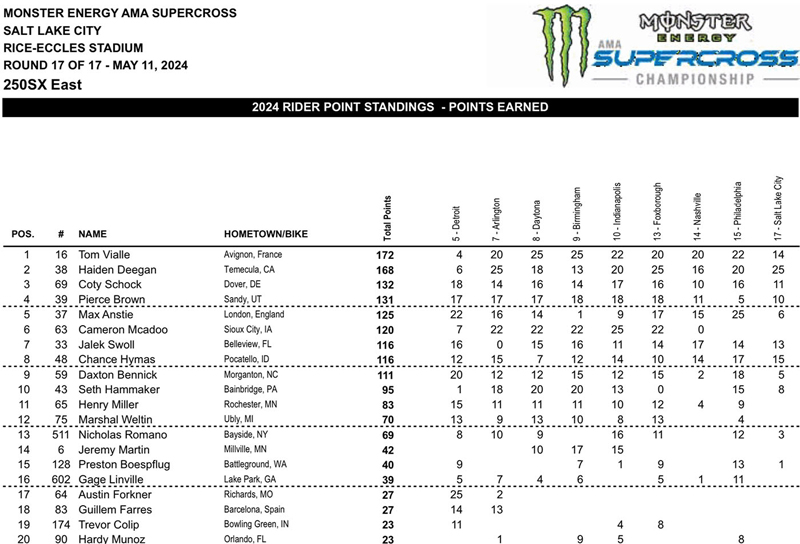 Meanwhile, defending champion Chase Sexton (KTM) took the win, his second of the season, in Utah at the weekend.