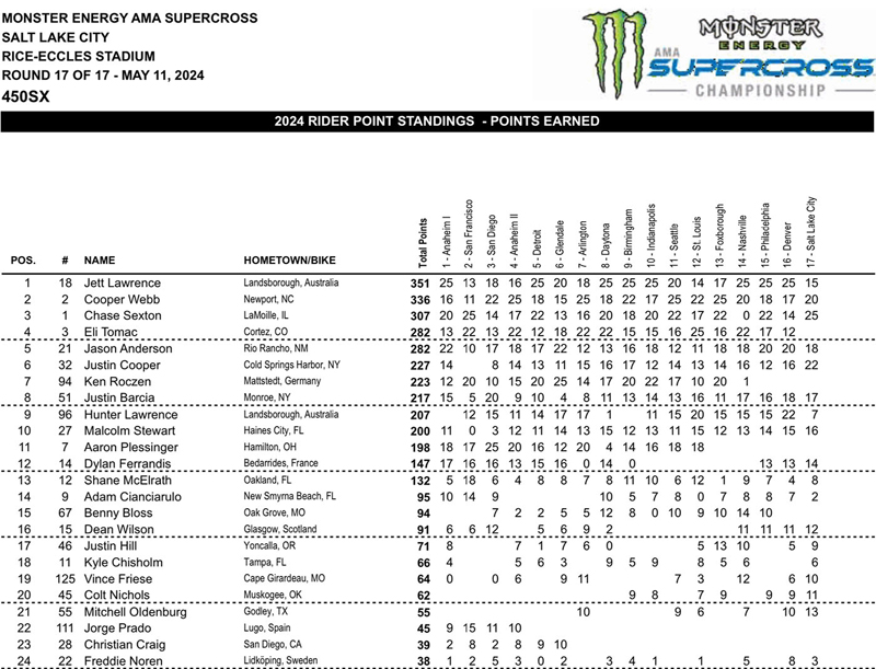 Jett Lawrence kicked off the year with a win at Anaheim 1, becoming the first rider to win in his premier-class debut. He added victories in Detroit, Daytona, Birmingham, Indianapolis, Nashville, Philadelphia and Denver (by comparison, the next most successful rider scored four victories).