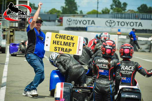 Check helmet strap! Yes you, right now! The instructions are clear as the sidecars class competitors start heading out onto the track at Manfeild, round two of the 2024 Suzuki International Series at the weekend. Photo by Andy McGechan, BikesportNZ.com