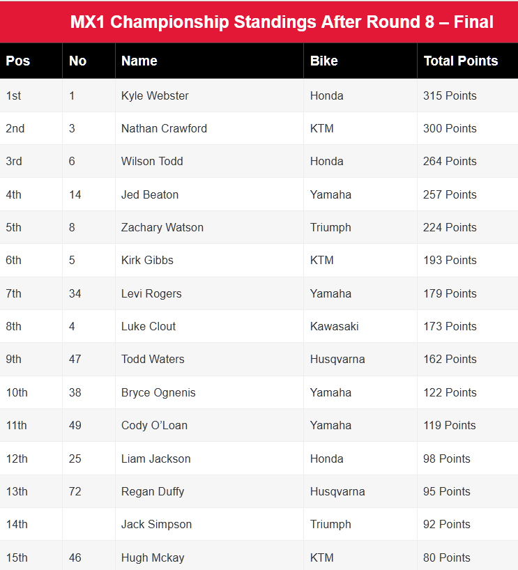 Kayd Kingsford stormed to the MX3 title, winning 11 of 16 races and six of eight overall rounds in a commanding season.